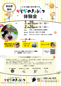 「からだのきょうしつ」体験会 開催! 理学療法士による指導のもと、お子さまの“姿勢”や“呼吸”、“体の使い方”を親子で楽しく体験できる教室です。 幼児期は、脳の発達と身体の発達が密接に関わる大切な時期。呼吸を整え、姿勢を […]